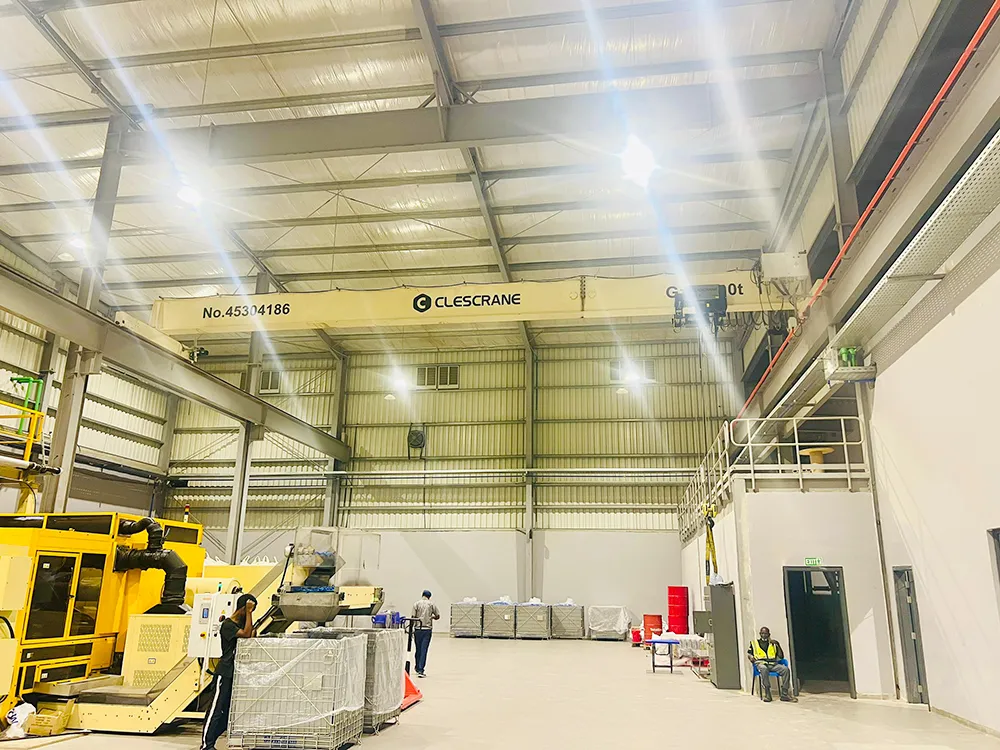A long-time customer in Ghana once again chose CLESCRANE and ordered a 10-ton overhead crane (CHS10t-16m-7.35m, A5/M5 pendant control) for their new injection molding production line equipped with a Husky system. The continued trust from our customers remains our greatest motivation. The end user, Blow Group of Companies, is one of the leading industrial groups in West Africa, with a wide portfolio covering beverages (alcoholic and non-alcoholic CSD), mineral water (PET/glass), PET packaging (preforms and caps), flexible packaging (PE extrusion, multilayer films, PP sheets, thermoforming, vacuum forming), and tissue conversion (toilet rolls, kitchen towels, napkins, pocket tissues). This new injection molding project marks an important step in enhancing their high-precision packaging capabilities.
